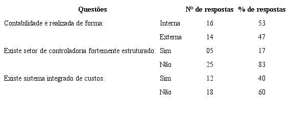 Para averiguar a importância dos sistemas de controle gerencial nos hospitais pesquisados, na Tabela 5 apresentam-se os resultados da pesquisa sobre a caracterização dos hospitais no que concerne à contabilidade, setor de controladoria e setor de custos.