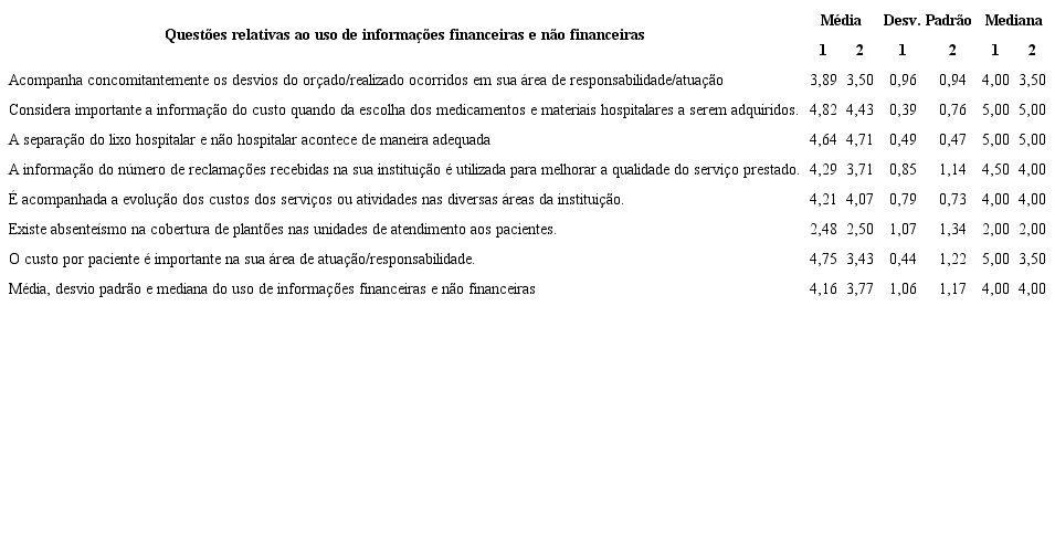 Investigou-se também a intensidade do uso de informações financeiras e não financeiras pelos dois grupos de gestores envolvidos nas áreas da alta direção dos hospitais, conforme demonstrado na Tabela 7.