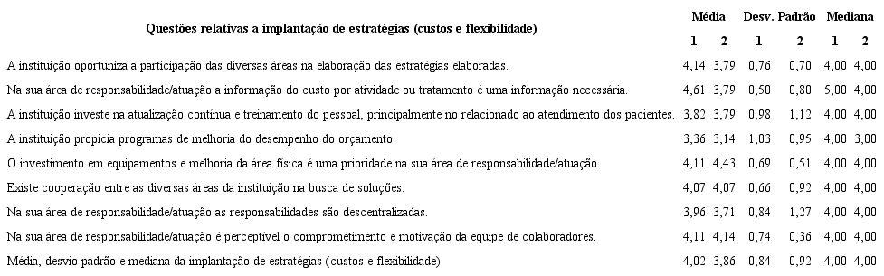 Após a identificação do perfil dos profissionais respondentes e da caracterização das organizações hospitalares participantes da pesquisa, efetuou-se o levantamento da percepção dos diferentes profissionais quanto ao uso de sistemas de controle gerencial no processo decisório de implantação de estratégias (custos e flexibilidade). Para a tabulação dos dados, utilizou-se uma legenda, de modo a agrupar os resultados. O código 1 representa os resultados dos respondentes responsáveis pelo setor administrativo. O código 2 apresenta os resultados dos respondentes responsáveis pelo corpo técnico ou clínico das organizações hospitalares.