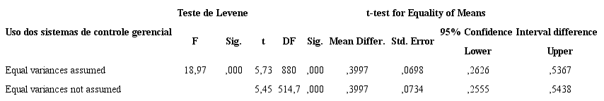 Observa-se na Tabela 9 primeiramente o teste de homogeneidade de variâncias (Levene), que busca verificar se os dois subgrupos são homogêneos ou diferentes. Os resultados indicam que as variâncias não são homogêneas, pois o p-value do teste (0,000) é inferior a um valor α =5%. Em seguida tem-se o teste t-student, para a situação de variâncias não homogêneas. A estatística do teste t apresentou um p-value de (0,000) para as duas amostras. Assim, infere-se que a percepção sobre o uso dos sistemas de controle gerencial (estilo de utilização do sistema de controle gerencial, uso de informações financeiras e não financeiras e implantação de estratégias) é estatisticamente diferente entre os gestores administrativos e os gestores do corpo clínico nos hospitais pesquisados.