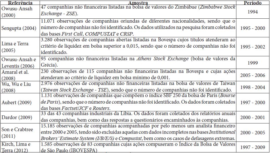 Os estudos nacionais Kirch, Lima e Terra (2012), Lima e Terra (2005) e Amaral et al. (2008) também encontraram coeficientes positivos e estatisticamente significantes para a mesma proxy. Em ambiente internacional, resultados semelhantes foram registrados por Sengupta (2004), Son e Crabtree (2011) e Bamber, Bamber e Schoderbek (1993).