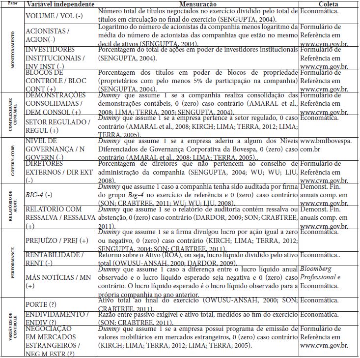 Por fim, destaca-se que foram classificadas como variáveis de controle aquelas que se mostram hábeis a capturar efeitos de mais de um dos fatores considerados por este estudo. Desta forma, as variáveis PORTE e NEG MERC ESTR seriam proxies tanto para monitoramento quanto para complexidade, sendo antagônicos os sinais esperados para o coeficiente a ser estimado. Para a variável ENDIV, os fatores conflitantes seriam monitoramento e relatório de auditoria.