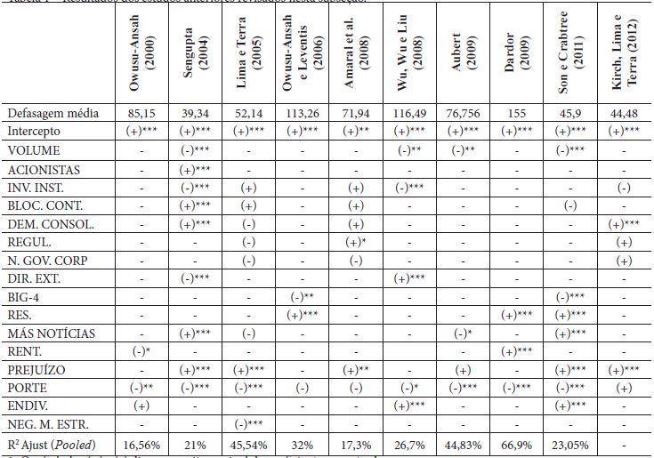 Os estudos recentes dedicados aos determinantes do timing das demonstrações contábeis foram resumidos no Figura 1, que descreve a amostra utilizada e o período de referência, e na Tabela 1, que elenca os resultados obtidos.
