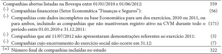 Para alcançar os objetivos propostos, foram selecionadas sociedades por ações abertas listadas na Bolsa de Valores de São Paulo (BM&FBOVESPA) de acordo com os critérios resumidos na Tabela 2, de modo que o grupo de interesse deste estudo ficou limitado a 322 companhias.