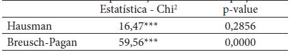 Diante disso, seguindo Wooldridge (2002, p. 264), aplicou-se o teste de Breusch- Pagan para a seleção da abordagem mais adequada entre o método de efeitos aleatórios com dados em painel e o método OLS pooled. Com vistas a verificar se a variância dos efeitos não observáveis (ci) tem valor significativamente igual a zero, foram testadas as hipóteses: