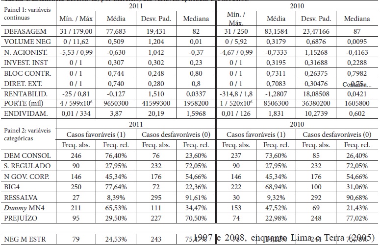 Os números da Tabela 4 corroboram a expectativa de ampliação da defasagem para as divulgações relativas ao exercício 2010. Essa ideia relacionada à preponderância dos fatores ligados à adoção ao novo padrão contábil (e as exigências adicionais impostas por este às companhias) é reforçada pela comparação do conteúdo da Tabela 4 com estudos anteriores. Apenas entre estudos nacionais, tem-se que Kirch, Lima e Terra (2012) verificaram defasagem média de 62,91 dias para as demonstrações anuais entre 1997 e 2008, enquanto Lima e Terra (2005) registraram defasagem média de 71,37 dias para 799 observações relativas aos exercícios entre 1995 e 2002. Amaral et al. (2008) encontraram média de 71,94 e mediana de 76 dias para 230 observações, considerados os exercícios 2005 e 2006. Por seu turno, Silva, Silva e Sancovschi (2006), com base em amostra de 209 companhias, encontraram defasagens médias de 76,2, 74,1 e 72,4 dias para os exercícios 2002, 2003 e 2004, respectivamente, e média de 74,2 dias para o período completo (2002 a 2004). Destaca-se que estes resultados referem-se a divulgações de demonstrações contábeis anuais de companhias listadas na BM&FBOVESPA.