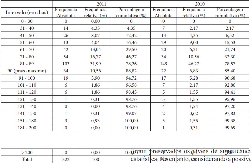 Feitas as considerações acima, outra dimensão de análise revela-se primordial para a compreensão dos padrões de tempestividade. Trata-se das características de frequência do comportamento da variável dependente defasagem, que são descritas Tabela 5.