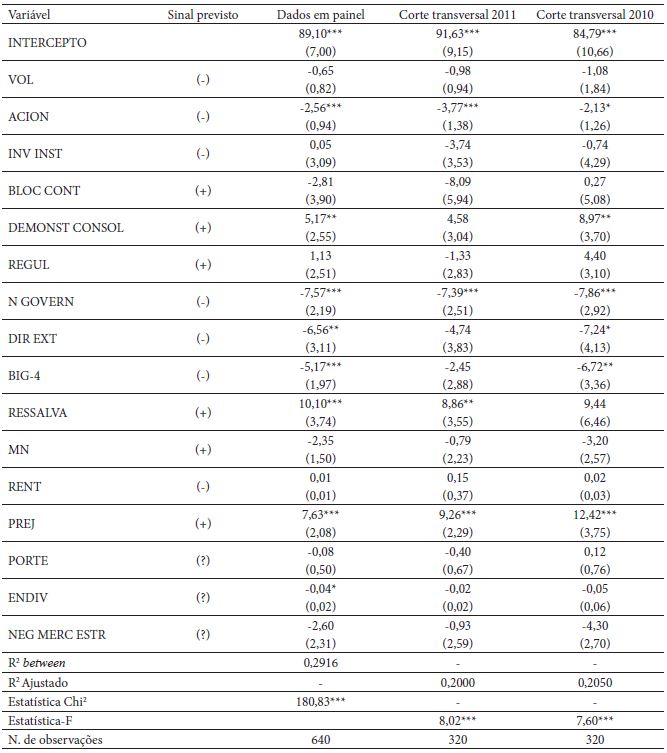 Adicionalmente, considerando a ampla utilização pela literatura dedicada ao tema e com o fim de verificar se os resultados são comparáveis, estimou-se modelo de regressão linear com dados em corte transversal agrupados (OLS pooled), similar ao da Equação 1, acrescentando, no entanto, a variável categórica (Dummy EXERC) que assume 1 se a observação é referente ao exercício 2011, 0 (zero) caso diga respeito a 2010. A inclusão da variável Dummy EXERC é justificada pela especificidade do período analisado por este estudo em relação à adoção integral do padrão IFRS (International Accounting Financial Standards), conforme será detalhado adiante.
