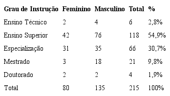 Como se observa na Tabela 1, do total de 215 respondentes, 135 são do gênero masculino e 80 do feminino. Quanto ao grau de instrução, 118 respondentes são graduados sem pós-graduação, desses 42 mulheres e 76 homens, e 6 são técnicos em contabilidade, 66 são especialistas, 21 mestres e 4 doutores.