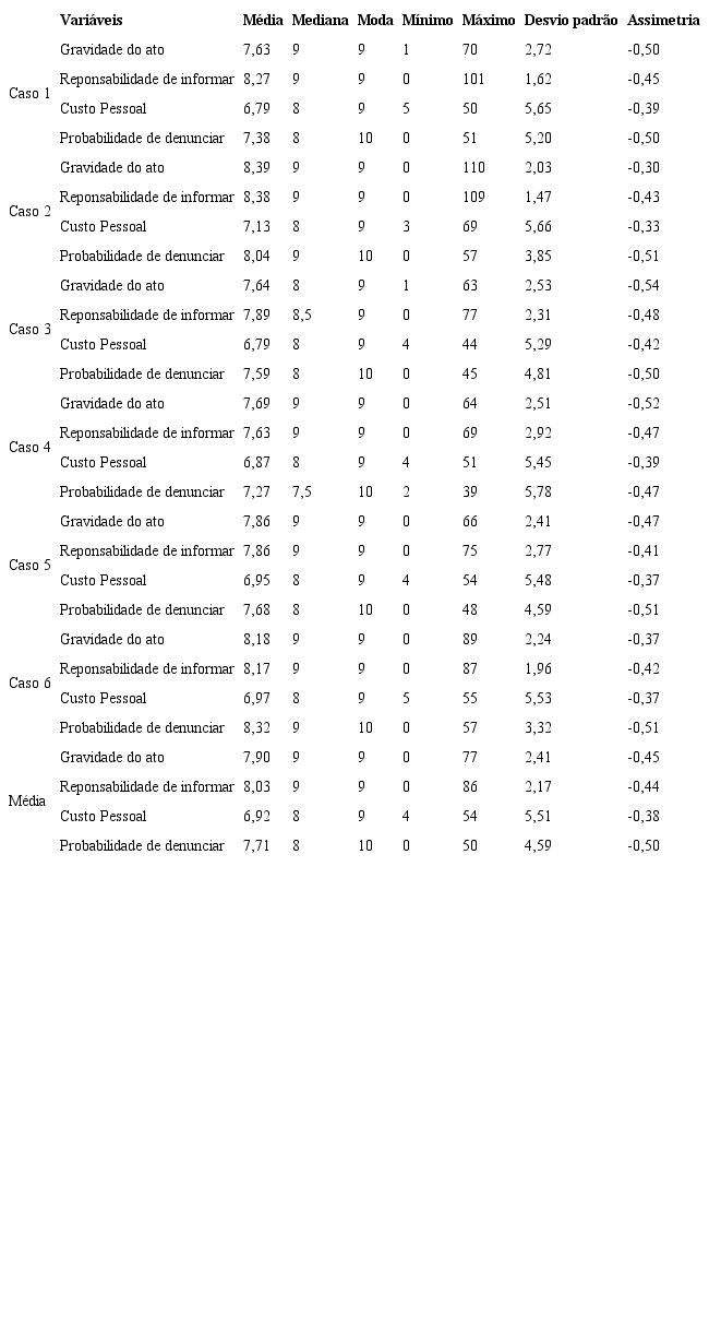 Quanto a mediana, verifica-se que, com exceção do caso 3, a mediana das variáveis Gravidade do ato e Responsabilidade de informar estão no nível 9, em outras palavras, 50% das respostas dos participantes para essas concentram-se nesse nível. No caso 4, a mediana da variável probabilidade de informar encontra-se entre o nível 7 e 8, ou seja, 50% dos respondentes fizeram a opção pelos níveis de 1 a 7 e os demais pelos 8 e 9.