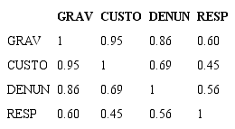Para se investigar o objetivo principal de pesquisa, três hipóteses serão testadas (representadas por , H1, H2 e H3). As variáveis foram definidas como grav (gravidade do ato), resp (responsabilidade de informar), custo (custo pessoal de denunciar) e denun (probabilidade de denunciar). A Tabela 4 apresenta a matriz de correlação.