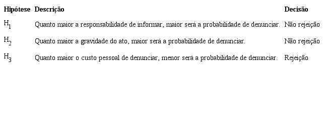 Para se cumprir o objetivo principal de pesquisa, três hipóteses envolvendo as quatro variáveis utilizadas foram estabelecidas: a probabilidade de denunciar um ato questionável é correlacionada positivamente à responsabilidade de denunciar esse ato (H1); A gravidade do ato é correlacionada positivamente com a probabilidade de denunciar (H2); e a probabilidade de denunciar um ato questionável é correlacionada inversamente ao custo pessoal que se espera por denunciar esse ato (H3). Os resultados indicam a não-rejeição de H1 e H2 e a rejeição de H3.