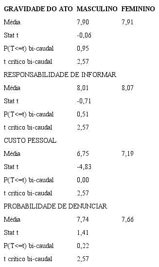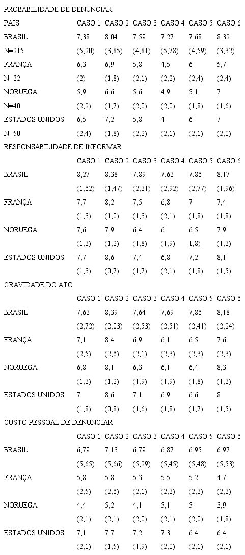 Em relação à variável probabilidade de denunciar, a média de todos os casos obtida no Brasil foi de 7,71 e nos EUA de 6,08. O t calculado foi de 4,4637, o que indica diferença estatística significante entre as médias. Assim, pode-se concluir que os brasileiros se comportaram de maneira positivamente mais forte, em relação à probabilidade de denunciar, que os respondentes estadunidenses, franceses e noruegueses.