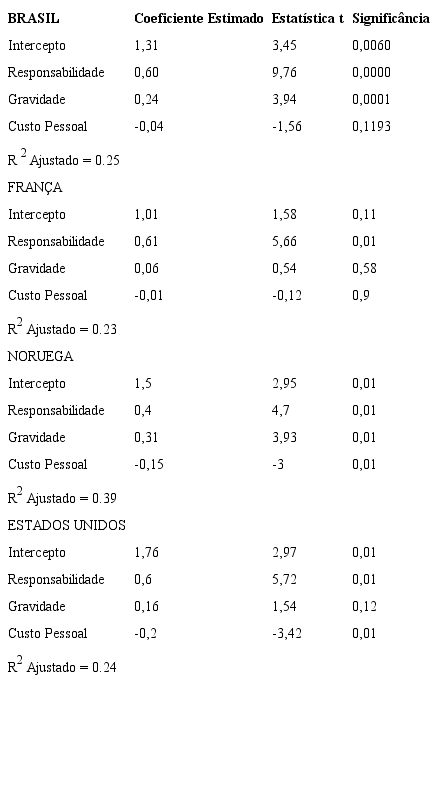 A Tabela 7 apresenta os dados da análise de regressão dos resultados obtidos no Brasil, Estados Unidos da América, França e Noruega, sendo os dados desses três últimos países extraídos do estudo de Shultz et al. (1993).