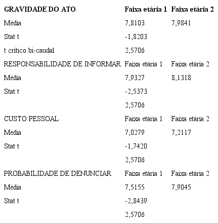 Quanto à variável probabilidade de denunciar, como as médias foram de 7,51 e 7,90 para os grupos faixa etária 1 e 2, respectivamente, e o t calculado de -2,84, há evidência de diferença estatística entre os grupos analisados. Dessa forma, não se rejeita a hipótese secundária de pesquisa (R1) para essa variável.
