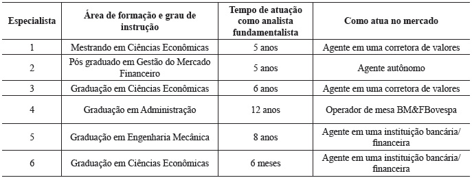 A aplicação da técnica Delphi ocorreu em dezembro de 2013. Nesta primeira rodada houve a participação de 6 analistas fundamentalistas. Portanto a pesquisa é válida, pois, conforme observam Velez-Pareja (2003), o número mínimo de especialistas a participar da técnica Delphi deve ser cinco (5). O perfil dos especialistas participantes da pesquisa é apresentado no Quadro 1.
