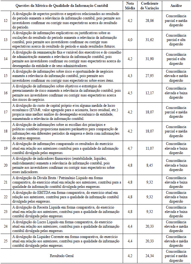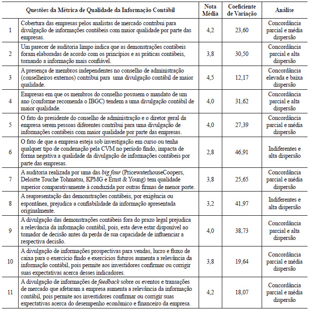 Os resultados do estudo possibilitaram construir uma MQIC com 17 componentes, representativos das características qualitativas representação fidedigna, relevância e comparabilidade, cuja nota varia numa escala de 0 a 100, sendo que, quanto maior for a pontuação da MQIC, melhor a qualidade da informação contábil divulgada pela empresa. A média geral da métrica final é de 4,3, indicando uma concordância elevada dos analistas fundamentalistas sobre os itens que compõem a MQIC. Além disso o Coeficiente de Variação é de 18,4% o que indica uma dispersão média dos dados. Os resultados do Alfa de Cronbach mostram que a MQIC possui consistência interna de 0,890.