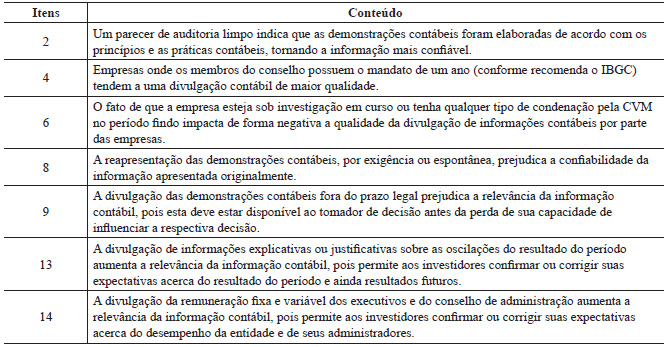 Biddle e Hilary (2006) explicam que informações contábeis com qualidade dificultam a ação discricionária dos gestores. Contudo, Beest, Braam e Boelens (2009) argumentam que normalmente são utilizadas medidas indiretas na mensuração da qualidade da informação, ou seja, focam em atributos específicos (gerenciamento de resultados) ou apenas em algumas das características qualitativas da informação contábil (oportunidade, conservadorismo, relevância, etc.). Além disso, Malaquias e Oliveira Neto (2011) consideram que, na construção de instrumentos de coleta de dados, seja levado em conta, por exemplo, a opinião de investidores e analistas de mercado.
