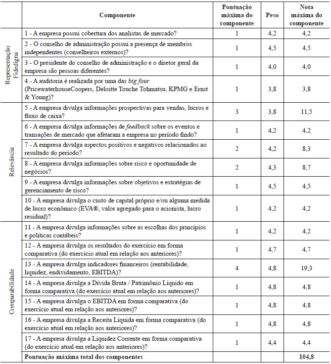 A MQIC é composta por 17 componentes (perguntas), cujas respostas espera-se positivas. Para cada componente com resposta positiva atribui-se um (1) ponto para a empresa, caso contrário atribui-se pontuação zero (0). Os componentes 5, 7, 8 e 13 possuem pontuação acima de um (1), por considerarem mais de uma informação, por exemplo, no componente 5 serão atribuído três (3) pontos para a companhia que divulgar informações prospectivas para vendas, lucros e fluxo de caixa. Isto é, para cada uma dessas informações divulgadas, a empresa receberá um (1) ponto.