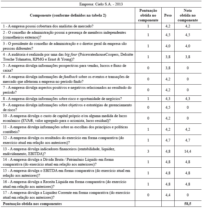 A pontuação máxima total dos componentes da MQIC é 104,8. Porém, visando facilitar a interpretação, a pontuação obtida no somatório dos componentes é transformada para uma escala de 0 à 100. Assim, assume-se que quanto maior for a pontuação da MQIC em uma escala que varia de 0 (zero) a 100 (cem), melhor a qualidade da informação contábil divulgada pela empresa. Visando exemplificar o cálculo da MQIC, utilizou-se as informações divulgadas pela empresa Cielo S.A. para o ano de 2013. A escolha da Cielo S.A ocorreu de forma aleatória, com o objetivo de simplesmente demonstrar o cálculo da MQIC e apresentar como exemplo uma breve análise dos resultados a partir da coleta da métrica.