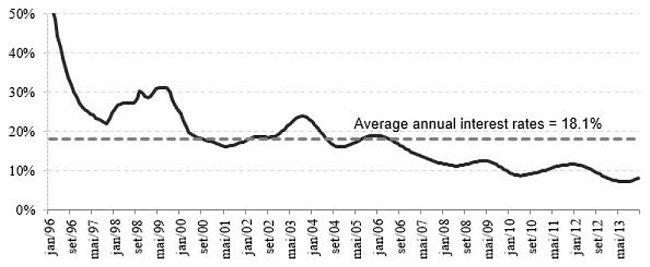 Different economic settings in terms of interest rates can change the time horizon of market agents and firms since higher interest rates make firm’s cost of borrowing money more expensive, reducing the ability to make new investments (SILBERBERG; SUEN, 2001). High interest rates are a common and persistent phenomenon in the Brazilian market which can have significant implications in the stock market returns. Figure 1 illustrates that during the analysed period the credit risk-free interest rates, measured by the nominal CDI rate (interbank deposit rate), are significantly higher than those in the US or other developed markets.