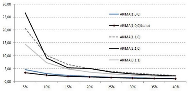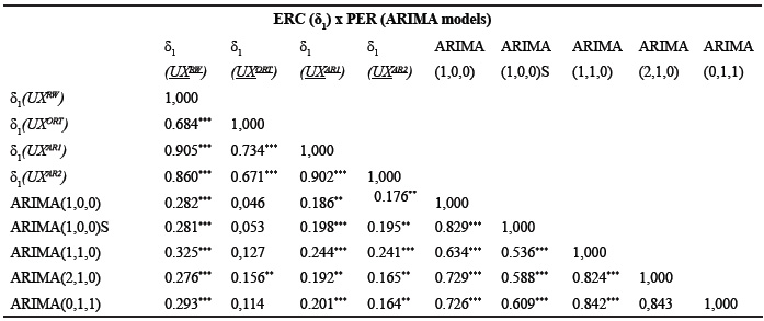 The second approach to examine the relation between ERC and PER - the OLS regression between the theoretical magnitudes of ERC due to PER parameter - is displayed in Table 6. Overall, the results corroborate the correlation coefficients previously discussed; however the additional tests of a slope coefficient equal to one are presented. The results show that only the non-integrated ARIMA and first-order autoregressive models have, at the same time, a linear relation different from one and are statistically indistinguishable from one.