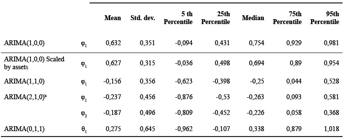 Table 1 presents the descriptive statistics for the firm-specific parameters estimated in each ARIMA model for reported annual earnings per share. Estimated coefficients present significant differences between firms in a given model. The two autoregressive models (ARIMA(1,0,0) and ARIMA(1,0,0) Scaled by assets) have similar distributional characteristics and show that, on average, around 63% of innovations in earnings seem to persist in the future. The majority of autoregressive coefficients fits between the 0 to 1 interval however some reversals (φ <0) can be observed after the 5thpercentile implying negative correlations between current and past earnings. These negative coefficients are also documented in previous literature (see KOTHARI, 2001, p.145).