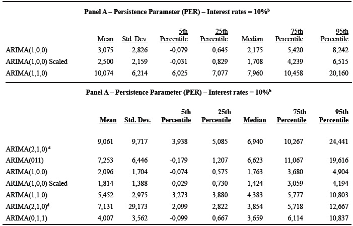 The results documented in Table 2 and Figure 2 also show that the PER parameters under high order ARIMA are smaller, more disperse and more sensitive to interest rates. Thus, high order ARIMA estimation does not imply higher persistence but the opposite: high order ARIMA decreases earnings persistence suggesting mean reversion over long horizons. Specifically, a smaller PER for high order models implies that “the earnings generating processes of these firms exhibit partial mean reversion” (LIPE and KORMENDI, 1994, p.34). In other words earnings are, on average, less persistent with long horizons. Additionally, the results suggest that integrated models are more associated with higher earnings persistence estimation