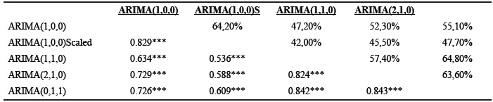 The second analysis aims to check whether different ARIMA assumptions affect the cross-sectional classification of firms in high and low earnings persistence. Basically, if different time-series assumptions affect the cross-sectional classification, they might lead to different results under different specifications. Hence, Table 3 (lower diagonal) shows the Spearman rank-order correlations between the five different time-series assumptions. Additionally, Table 3 shows the portfolio discrimination accuracy for the pairwise comparison, i.e. firms were divided into four portfolios according to the magnitude of earnings persistence. Thus, firms were divided into portfolios with high, average-high, average-low and low persistence firms and accounted for the percentage of correspondence between the portfolios’ classification. This means, for instance, that 64.2% of firms have exactly the same portfolio classification in ARIMA(1,0,0) and ARIMA(1,0,0)Scaled methods.