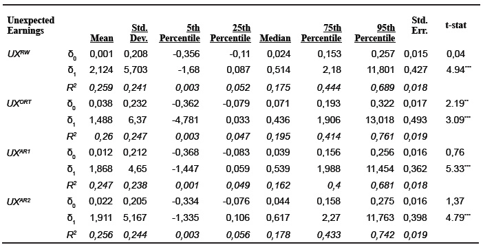 The results presented in Table 6 do not support Ali and Zarowin (1992b) who argue that scaled earnings variation can be biased towards zero. Although studies might exercise caution when using scaled variation of earnings, in the Brazilian market, the random walk assumption in unexpected earnings measure does not seem to yield inferior results than other commonly used models in the literature.