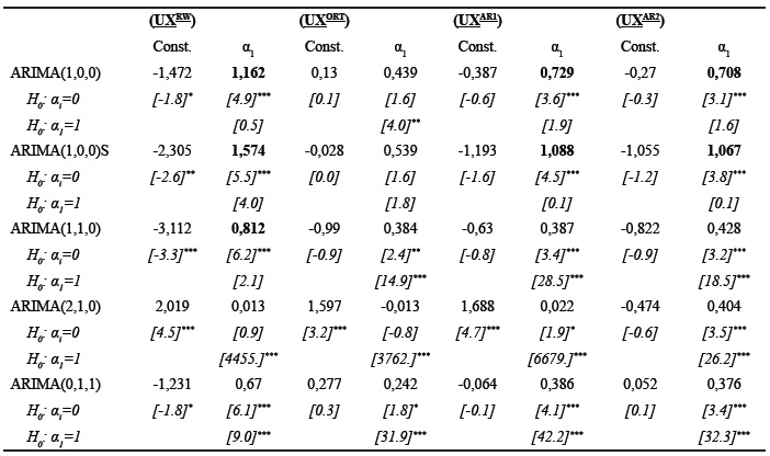 The highest levels of correlation are those under the scaled earnings change, UXRW , measure of unexpected earnings (around 30%). The two autoregressive measures, UXAR1 and UXAR2 , have similar coefficients with the first-order model having a small advantage when compared with the second. The practical implication of these results is as follows: first, a simple random-walk assumption seems to outperform more complex autoregressive measures when the earnings-return relation is analyzed; second, differently from the international literature (KORMENDI and LIPE, 1987; LIPE and KORMENDI, 1994; BAGINSKI et al., 1999), we document that loworder autoregressive models work at least as well as high-order models in representing the time-series process of earnings in the earnings-returns association.