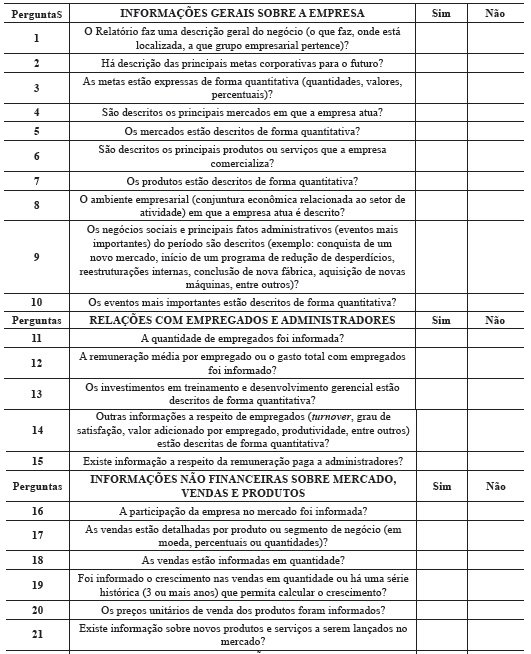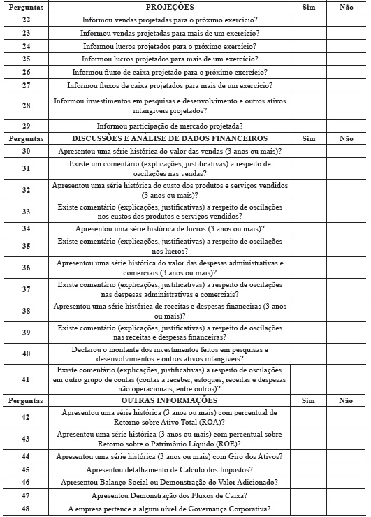 O índice desenvolvido por Alencar (2007) é composto por 47 perguntas e, a cada resposta “sim”, foi atribuído um ponto e, para a resposta “não”, a nota atribuída foi zero. De acordo com Alencar (2007), esse índice engloba seis dimensões de informação e, em cada dimensão, a nota obtida pela empresa foi apurada pela divisão entre a soma dos pontos obtidos e a pontuação total possível. Acrescentou ao modelo a pergunta de número 48 conforme demonstrado no Quadro 1.