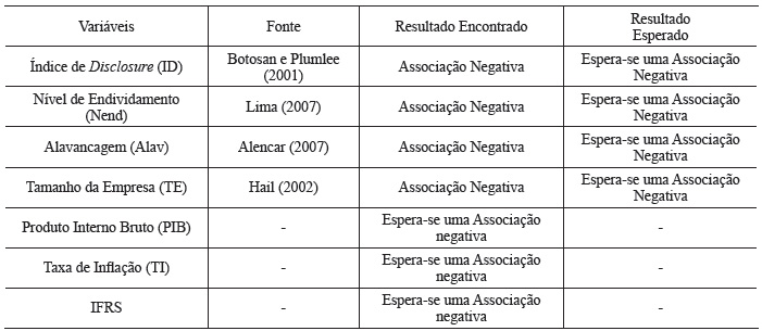 O Quadro 2 apresenta um resumo das variáveis de controle utilizadas durante a elaboração das regressões para estimar o custo de capital próprio das empresas.