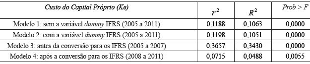 A Tabela 4 apresenta e compara os modelos escolhidos entre os anos de 2005 até 2011 para a estimação do custo de capital próprio.