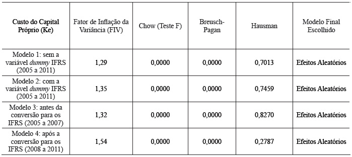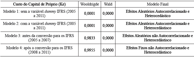 Nos modelos selecionados apenas as variáveis nível de endividamento e IFRS apresentaram-se significativas considerando 5% de aceitação, com a variável nível de endividamento contribuindo para o aumento do custo de capital uma vez que os valores dos coeficientes nos dois modelos foram positivos, porém a variável IFRS apresentou valor negativo contribuindo para a redução do custo de capital próprio.