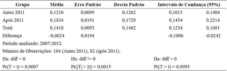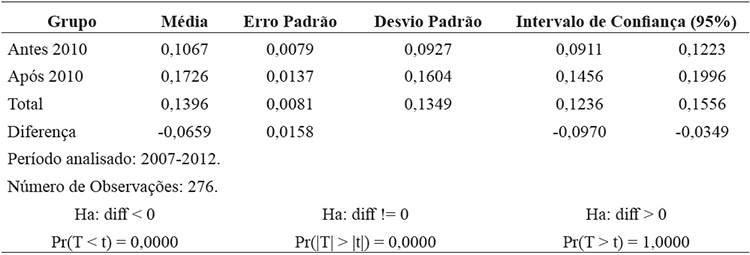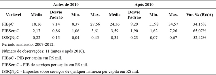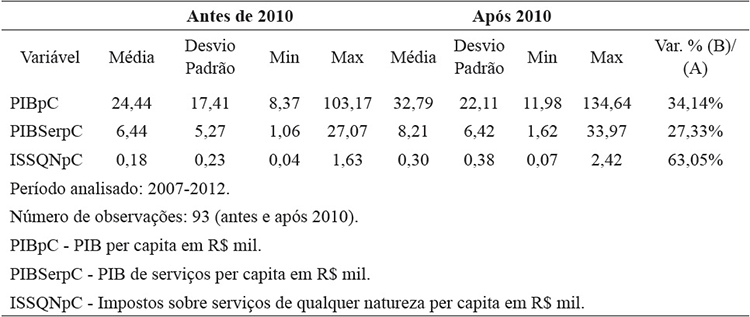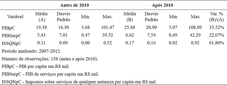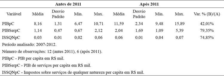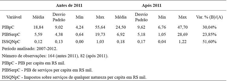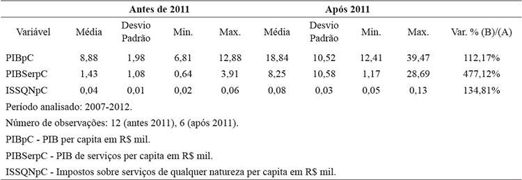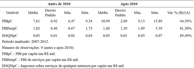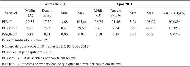 Para a análise dos números levantados, verificou-se que o ano 2011 apresentou o maior número de implantações da nota fiscal de serviços eletrônica (52 municípios). Considerando a restrição de levantamento de dados fornecidos pelo Tesouro Nacional de dados de arrecadação até 2012, o ano de 2010 (terceiro ano com o maior número de implantações, com 39 municípios) possibilita também uma análise relevante por apresentar um período maior para a análise de dados após a implantação. Foram feitas então duas análises separadas considerando os anos de 2010 e 2011 como os de interesse a serem utilizados como parâmetros de pós implantação da nota fiscal de serviços eletrônica.
