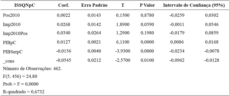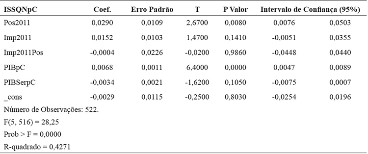 Nessa sessão serão apresentados os resultados das regressões múltiplas na aplicação do modelo diferenças em diferenças com a utilização de dados em painel, analisando a variável dependente ISSQN per capita, onde chegou-se aos dados constantes nas Tabelas 13 e 14. É possível verificar pela variável de interação Imp2010pos (Tabela 13 - ano de interesse 2010) e pela variável de interação Imp2011pos (Tabela 14 - ano de interesse 2011) um efeito positivo causado pela implantação da nota fiscal de serviços eletrônica. Entretanto, considerando tanto para o ano de interesse 2010 como o ano de interesse 2011 a análise de P valor esse efeito não se mostrou significativo.