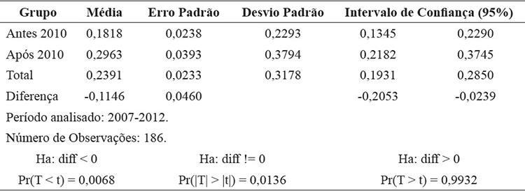 A importância dos anos de interesse deve-se ao fato de que as cidades que implantaram a nota fiscal de serviços eletrônica em um ano diferente devem ser excluídas da base já que a tendência de arrecadação nesses municípios estaria influenciada pela implantação dessa mudança em um ano diferente. Considerando como ano de interesse o ano de 2011 teremos como histórico de pós implantação o período abrangido por 2011 e 2012. Já para o ano de interesse 2010, teremos um histórico antes da implantação de 2007 a 2009 (3 anos) e um histórico de pós- implantação de 2010 a 2012 (3 anos).