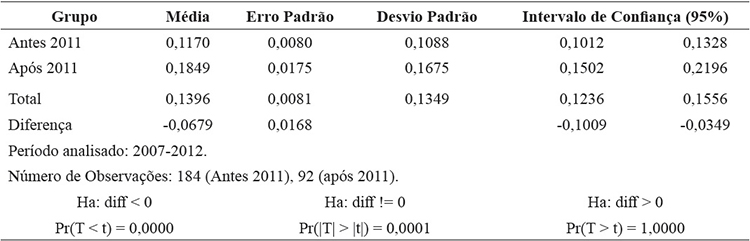 Observa-se, com base nas Tabelas 1 e 3 que tanto os municípios que implantaram a NFs-e quanto os que não implantaram tiveram aumentos da arrecadação do PIB, PIB de serviços e ISSQN per capita semelhantes após 2010. Já a Tabela 2 apresenta o teste de médias que informa que os municípios que não implantaram a NFs-e apresentam uma curva crescente da arrecadação de ISSQN per capita. Essa curva crescente de arrecadação também foi confirmada nos municípios que implantaram a NFs-e pelo teste das médias apresentado na Tabela 4.