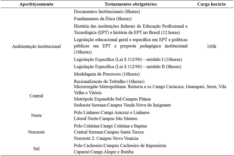 O treinamento utilizado nesta pesquisa foi oAperfeiçoamento I -Ambientação Institucional (Ambientação), instituída como capacitação obrigatória para todos os novos servidores a partir da edição da Resolução nº 14/2008, do Conselho Diretor da Instituição. A Ambientação é composta por 8 treinamentos obrigatórios, que deveriam ser feitos em até 2 anos e 8 meses a partir do ingresso no Órgão (IFES, 2016).