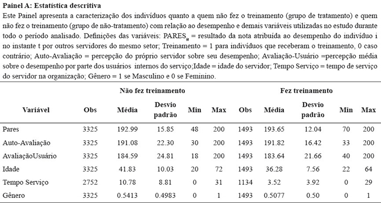 A partir da coleta de dados foram selecionados indivíduos que participaram e que não participaram de treinamentos para comparação de seus desempenhos. Os indivíduos foram classificados quanto a quem fez treinamento e quem não o fez. Para isso, foi criada uma variável dummy Treinamento igual a 1para indivíduos que receberam treinamento, e 0 caso contrário. A estatística descritiva das variáveis observadas neste estudo consta no painel A da Tabela 1 a seguir. No painel B, encontram-se os resultados dos testes de diferenças de médias para as variáveis utilizadas entre os dois grupos de indivíduos.