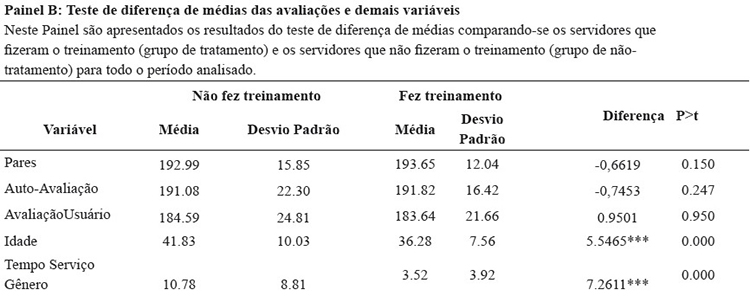 O painel B mostra os resultados dos testes de diferenças de médias das avaliações dos dois grupos de indivíduos para todo o período analisado. Verifica-se que, embora existam diferenças entre os indivíduos que fizeram e não fizeram treinamento em relação à idade e tempo de serviço, os dois grupos não apresentaram diferenças significativas com relação às médias de desempenho quando analisado todo o período da amostra. Em particular, tal resultado está alinhado com o objetivo da Ambientação que visava promover treinamento introdutório aos novos servidores, para que esses pudessem ter melhor desempenho em suas funções.