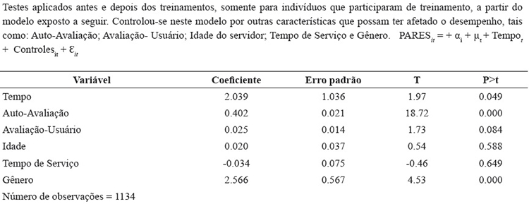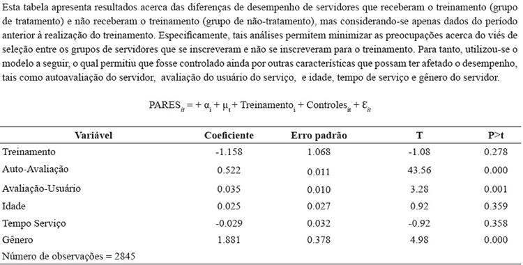 Na Tabela 2 são apresentados testes complementares ao teste de diferença de médias para os dois grupos de indivíduos, utilizando apenas dados de antes da realização de treinamentos, com o intuito de mitigar problemas de auto-seleção e verificar que os desempenhos desses indivíduos antes dos treinamentos eram iguais. Observa- se que como o coeficiente da variável treinamento não foi significativo, os desempenhos dos indivíduos que treinaram e não treinaram não eram diferentes no período anterior ao treinamento. Assim, indivíduos treinados e não treinados receberam a mesma média de avaliações antes dos treinamentos, o que mitiga e minimiza problemas associados à auto-seleção.