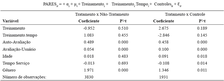 Na Tabela 4 são apresentados os resultados da estimação do modelo 1 considerando-se as duas especificações propostas. Primeiramente o desempenho de servidores que receberam o treinamento (grupo de tratamento) foi comparado ao desempenho ds servidores que não receberam o treinamento (grupo de não-tratamento). Em um segundo momento, o mesmo modelo foi estimado, mas considerando como grupo de controle apenas os servidores não treinados e que entraram no mesmo período que os servidores que receberam o treinamento (servidores que ingressaram depois de 2008).