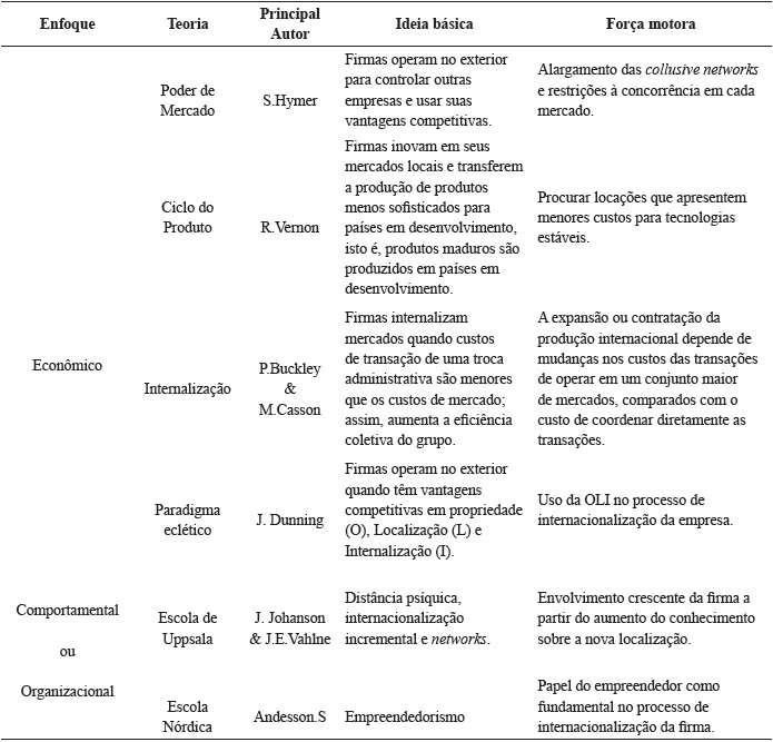 Com finalidade de dar uma visão mais global das principais teorias da internacionalização, apresenta- se, a seguir, um quadro-resumo elaborado por Hemais e Hilial (2004), focando os principais autores e pontos defendidos das duas perspectivas ou enfoques: um sobre uma vertente econômica e outro sobre uma vertente organizacional ou comportamental.