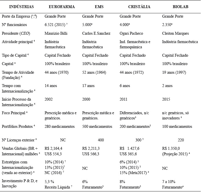 A coleta dos dados constantes nos quadros 2 e 3 do estudo, foram obtidas com base em material publicado nos sites das empresas analisadas, press-releases, vídeo institucional, revista Exame “Melhores e Maiores” julho de 2016, revista Valor Econômico “1000 Maiores Empresas” de setembro de 2016, revista Valor “Inovação Brasil” de julho 2016, Revista Folha de São Paulo de 29 de julho de 2016, relatório anual de 2016 encaminhado pelo Laboratório Eurofarma, relatórios financeiros afixados no próprio site dos laboratórios e informações coletadas nos sites do Banco Nacional Desenvolvimento Social [BNDES] (2017) e do Serviço Brasileiro de Apoio às Micro e Pequenas Empresas [SEBRAE] (2017).