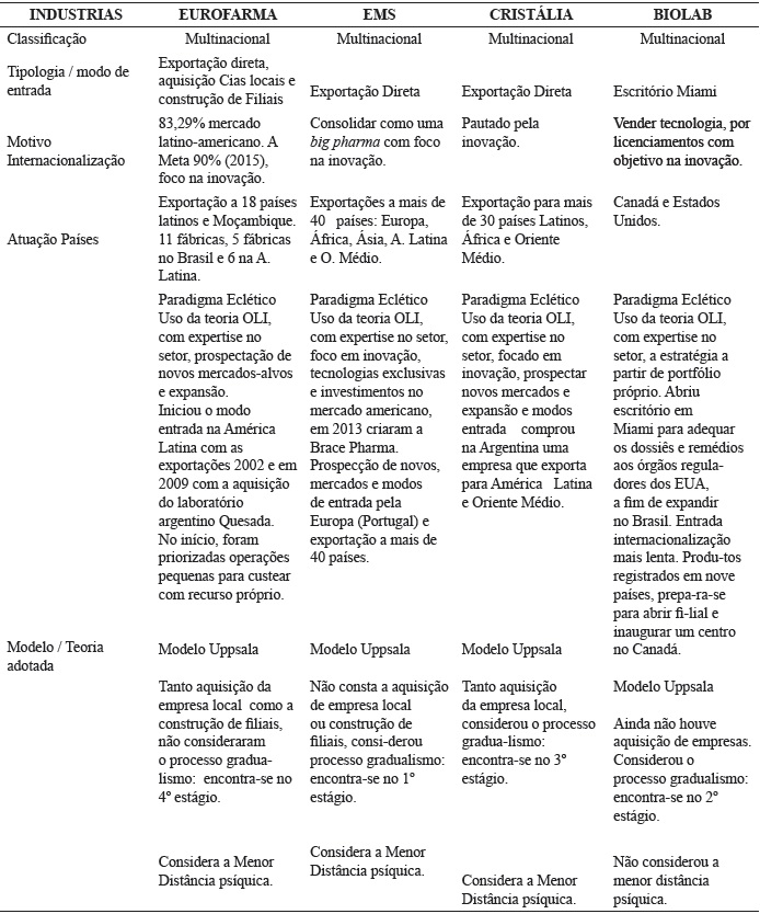 Quanto à classificação das indústrias farmacêuticas brasileiras pesquisadas, todas são classificadas como multinacionais, conforme descrito, na literatura, pelos autores Bartlett e Ghoshal (1992), Canals (1994). Dyment (1987). As empresas apresentam tipologias diferenciadas para os modos de entrada no mercado estrangeiro: Eurofarma, o EMS e Cristália, por exportação direta, e Biolab por via contratual, de acordo com Root (1994).