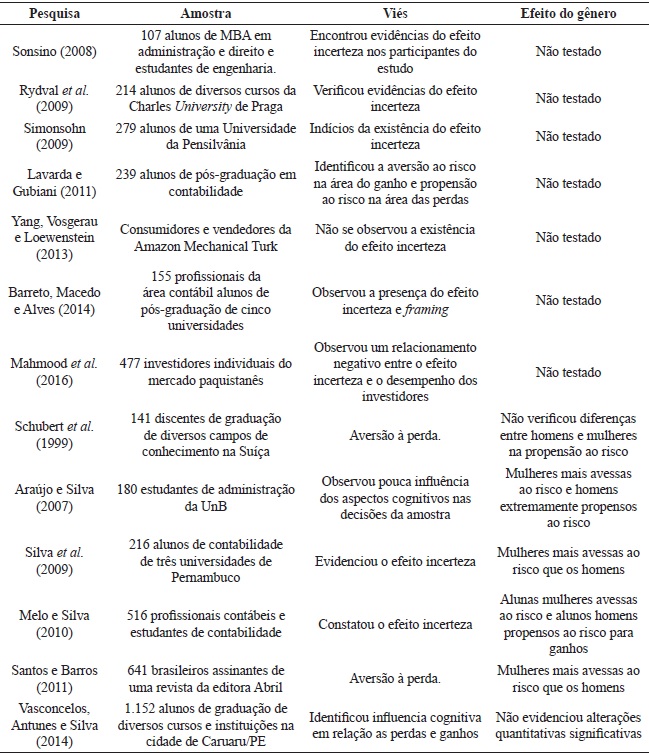 Verifica-se, com base nas pesquisas anteriores sobre finanças comportamentais relacionadas acima, que o efeito incerteza já foi evidenciado tanto em estudos nacionais como internacionais em diversas localidades. No entanto, constata-se que o efeito do gênero, ainda é um assunto pouco investigado e controverso, uma vez os resultados encontrados divergem quando a influência dessa variável na tomada de decisão financeira dos indivíduos, apesar dos estudos que evidenciaram a influência do gênero apontarem que as pessoas do gênero feminino apresentam uma aversão ao risco mais acentuada do que as do gênero masculino.