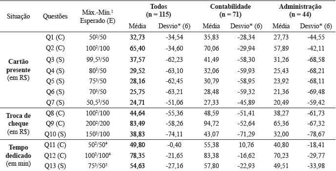 Dentre os 115 questionários válidos para a análise, verifica-se que 61,74% dos respondentes são discentes do curso de ciências contábeis (71 respondentes) e 38,26% cursam o curso de administração (44 respondentes). Na Tabela 1 são apresentados os resultados da estatística descritiva, para cada uma das situações propostas no questionário de pesquisa, como também o valor máximo e mínimo esperado para cada uma das questões.