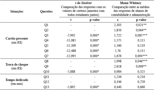 Para analisar se existem diferenças significativas entre as decisões dos alunos dos cursos de contabilidade e administração de empresas, foi utilizado o teste de Mann-Whitney. Observa-se, na Tabela 2, indicativos de que os discentes desses dois grupos, processam as informações disponíveis de modo diferente ao avaliar a respeito de perdas e ganhos como defendido por Wang, Feng e Keller (2013), visto que os alunos dos dois grupos quando expostos a situações de incerteza apresentam comportamento similar.